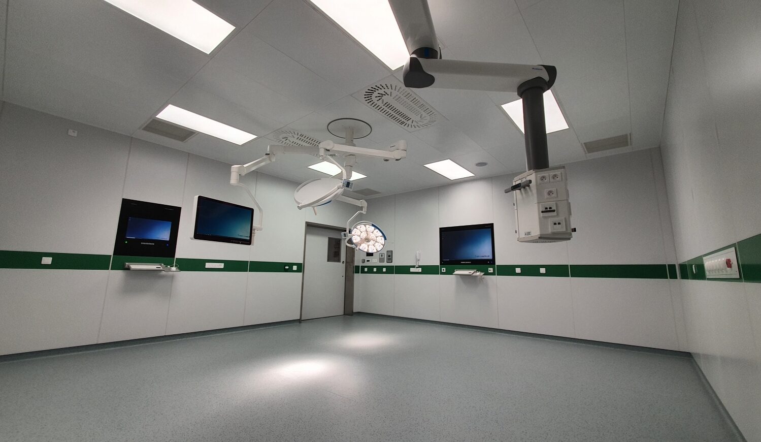 Création clés-en-main de salle d’opération avec cloisons modulaires, murs, plafonds, portes, lots CVC/CFA/CFO/FM/PB/MIN/BIO, et équipements MACH LED8/LED6 dernière génération avec écrans Operion et vidéo-management Smart OR.